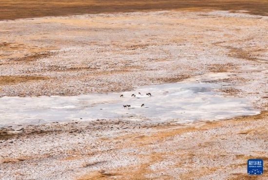 阿爾金山國(guó)家級(jí)自然保護(hù)區(qū),一群藏羚在冰河上(無(wú)人機(jī)照片,12月22日攝)。