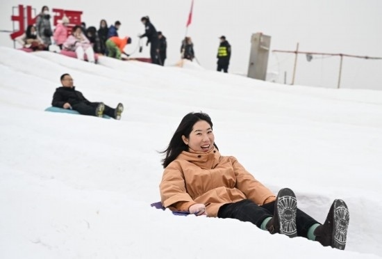 冬季的內(nèi)蒙古賽馬場(chǎng)變成了冰雪樂園,場(chǎng)地中間建起一座十幾米高的人造雪山,等著玩滑雪圈的人群從山頂一直排到山腳下,周圍還有冰上腳踏車、冰上陀螺等冰雪體驗(yàn)設(shè)備。曹博雅坐著雪圈從山頂飛速滑下,又拉著爸爸坐上了旋轉(zhuǎn)小雪車。