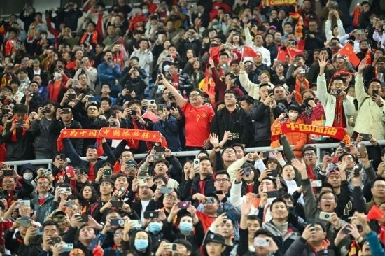 當(dāng)球員入場時(shí),球迷們將寫著“為中國而戰(zhàn)”的紅色圍巾高舉頭頂,場面壯觀。印有“精忠報(bào)國”的巨幅球員畫像在球迷看臺隨“人浪”翻滾。奏國歌環(huán)節(jié),一面巨大的五星紅旗被高高撐起在看臺上,數(shù)萬名球迷齊唱國歌,中國隊(duì)11名首發(fā)球員注視著這個方向,一同歌唱。