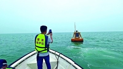 廣西合浦儒艮國家級(jí)自然保護(hù)區(qū)工作人員檢查海洋哺乳動(dòng)物水下聲學(xué)監(jiān)測(cè)浮標(biāo)。