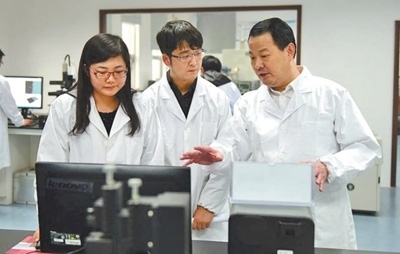 彭壽(右一)在指導(dǎo)實驗。中建材玻璃新材料研究總院供圖