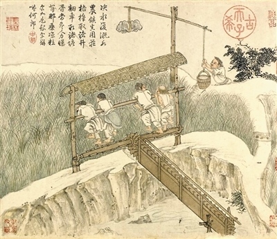 通過品讀繪畫中的水利機(jī)具發(fā)展變化,不僅可以直觀感受勞動(dòng)技術(shù)的進(jìn)步,還有助于從古人識(shí)水、用水的智慧中汲取養(yǎng)分。