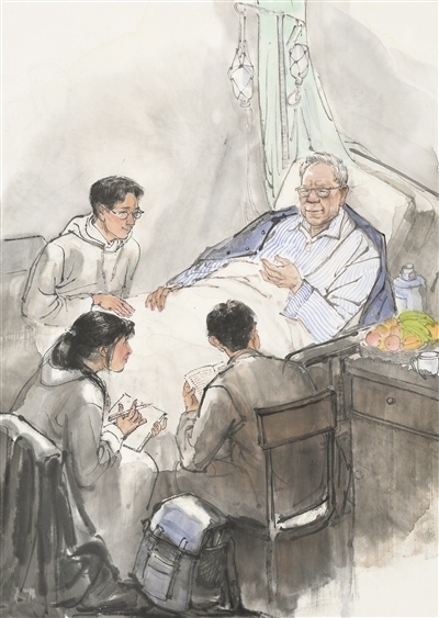 人民教師勤學(xué)篤行、求是創(chuàng)新的躬耕態(tài)度,給無數(shù)人以榜樣的力量,也給美術(shù)創(chuàng)作以靈感。“人民教育家”國家榮譽稱號獲得者衛(wèi)興華,終其一生都奮斗在勤學(xué)求真的道路上。90余歲時,即使病痛纏身,他仍堅持每天學(xué)習(xí)、工作。有感于衛(wèi)興華教授的敬業(yè)精神,高毅特意描繪了臥病在床的衛(wèi)興華堅持與學(xué)生探討學(xué)術(shù)課題的場景,主人公那專注的神情令人動容。像衛(wèi)興華這樣堅守耕耘的教師還有許多。劉昌明水彩畫《一個教師的工作臺》便以細(xì)致的場景描繪表達(dá)出對教師群體的敬意。貼著泛黃舊紙的墻面、藥瓶和墨水瓶之間的教案、脫漆的木桌、一副老花眼鏡……畫家在此調(diào)動了一切能夠反映老一輩教育者辛勤伏案的元素,象征著沒有直接出場的教師形象?!按颂師o聲勝有聲”的表達(dá)效果,令人回味無窮。