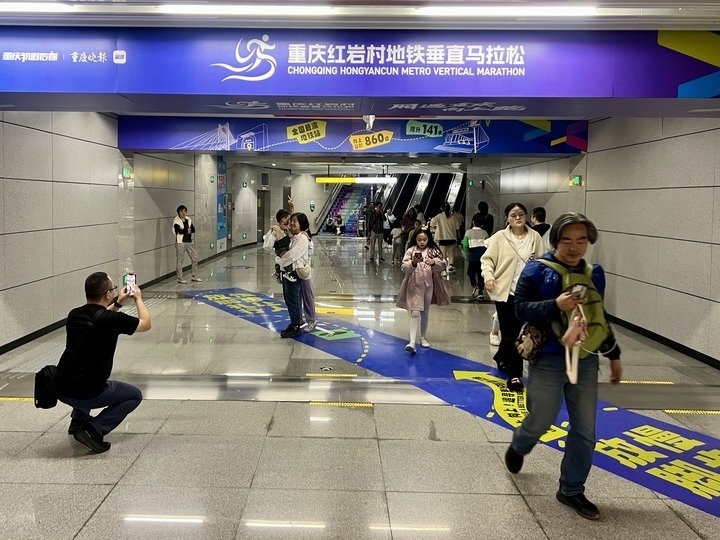 國慶前夕,這里剛舉辦了一場垂直馬拉松。賽事帶來品牌效應(yīng),前來打卡的人群絡(luò)繹不絕。“垂直馬拉松一般在摩天大樓里舉辦,如今地鐵站里居然能跑馬拉松,重慶總是能給游客帶來驚喜?!眮碜院颖钡挠慰蛷堥f。