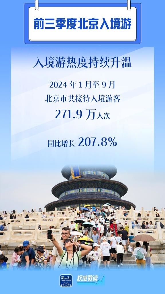 隨著中國(guó)免簽“朋友圈”持續(xù)擴(kuò)容、便利人員往來(lái)措施不斷優(yōu)化,北京入境游市場(chǎng)加快恢復(fù)。北京市文化和旅游局日前發(fā)布數(shù)據(jù)顯示,2024年1月至9月,北京共接待入境游客271.9萬(wàn)人次,同比增長(zhǎng)207.8%。從單月恢復(fù)情況看,5月以來(lái)市場(chǎng)恢復(fù)速度加快,9月為年初以來(lái)的峰值,入境游客達(dá)38.4萬(wàn)人次,增長(zhǎng)趨勢(shì)明顯,正逐步接近2019年同期水平。