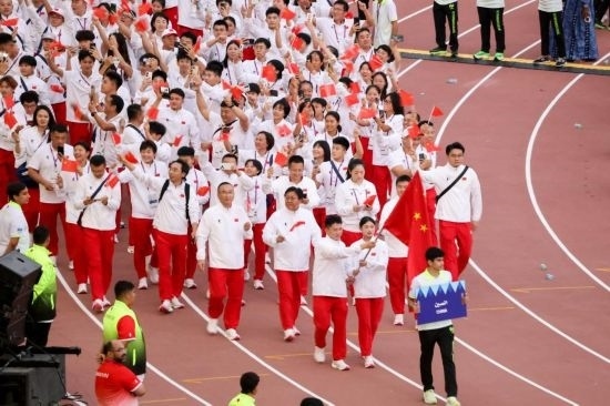 開幕式上,中國代表團第13個入場,旗手由乒乓球隊男子運動員李天陽和跆拳道隊女子運動員酈雨琪擔(dān)任。本屆運動會中國代表團共派出全國22個省區(qū)市的103名運動員參賽,其中女子運動員55人,男子運動員48人,將參加田徑、游泳、三對三籃球、沙灘排球、網(wǎng)球、跆拳道、國際象棋等17個大項、124個小項的比賽。