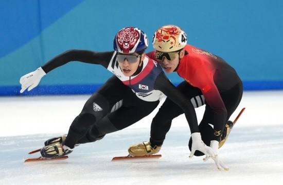 2月9日,中國隊選手林孝埈(右)、韓國隊選手樸智元在比賽中發(fā)生身體碰撞。新華社記者 顏麟蘊 攝
