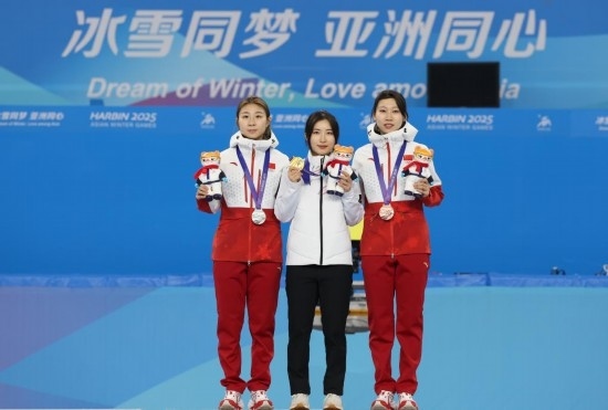 2月8日,冠軍韓國選手金吉莉(中)、亞軍中國選手公俐(左)和季軍中國選手臧一澤在頒獎儀式上合影。當日,在哈爾濱舉行的第九屆亞冬會短道速滑女子1500米A組決賽中,韓國選手金吉莉奪得冠軍,中國選手公俐、臧一澤分別獲得亞軍、季軍。新華社記者 張濤 攝