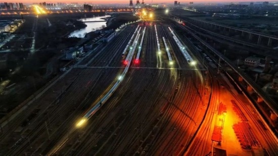 除夕當(dāng)天,石家莊動車運(yùn)用所被金色的晨曦照亮。