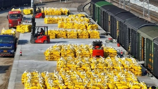 2月11日,石家莊鐵路物流中心辛集營業(yè)部晉州貨場內(nèi),一袋袋化肥從棚車卸下,準(zhǔn)備運(yùn)往田間地頭。