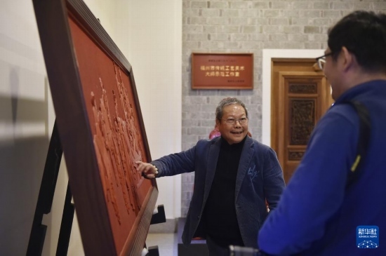 3月4日,中國(guó)工藝美術(shù)大師袁師永在自己的工作室為來(lái)訪者介紹傳統(tǒng)漆藝作品。