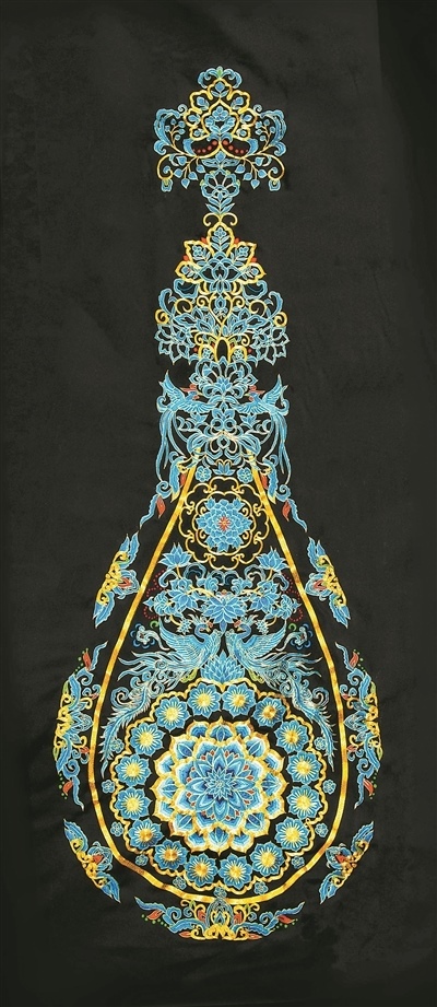 圖為金馨京繡《翠色雙鳳蓮花喜相逢寶瓶》。