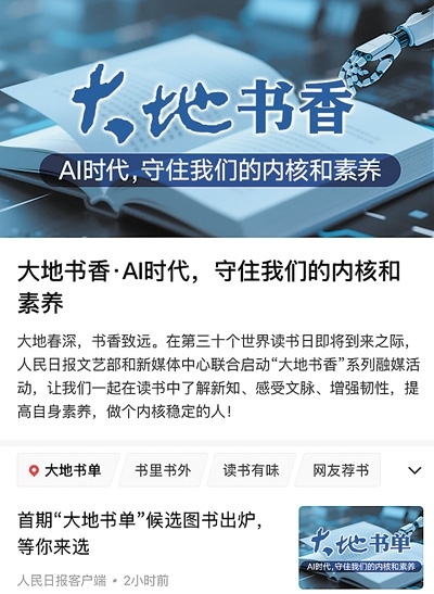 習(xí)近平總書(shū)記在今年全國(guó)兩會(huì)期間的重要講話中指出“書(shū)香是一種氛圍”“數(shù)字閱讀要和傳統(tǒng)閱讀結(jié)合起來(lái),守住我們的內(nèi)核和素養(yǎng)”。在第三十個(gè)世界讀書(shū)日即將到來(lái)之際,人民日?qǐng)?bào)社文藝部和新媒體中心聯(lián)合啟動(dòng)“大地書(shū)香”系列融媒活動(dòng),并圍繞“AI時(shí)代,守住我們的內(nèi)核和素養(yǎng)”推出首期“大地書(shū)單”。來(lái)自出版、文藝、科技、教育等不同領(lǐng)域的20位薦書(shū)人,推薦出35本候選圖書(shū),在人民日?qǐng)?bào)客戶端“大地書(shū)香”專題予以集中呈現(xiàn),參照網(wǎng)友的評(píng)論與推薦,最終推選出10本上榜圖書(shū)。讓我們多讀書(shū)、讀好書(shū),一起在氤氳著書(shū)香的大地上行穩(wěn)致遠(yuǎn)。