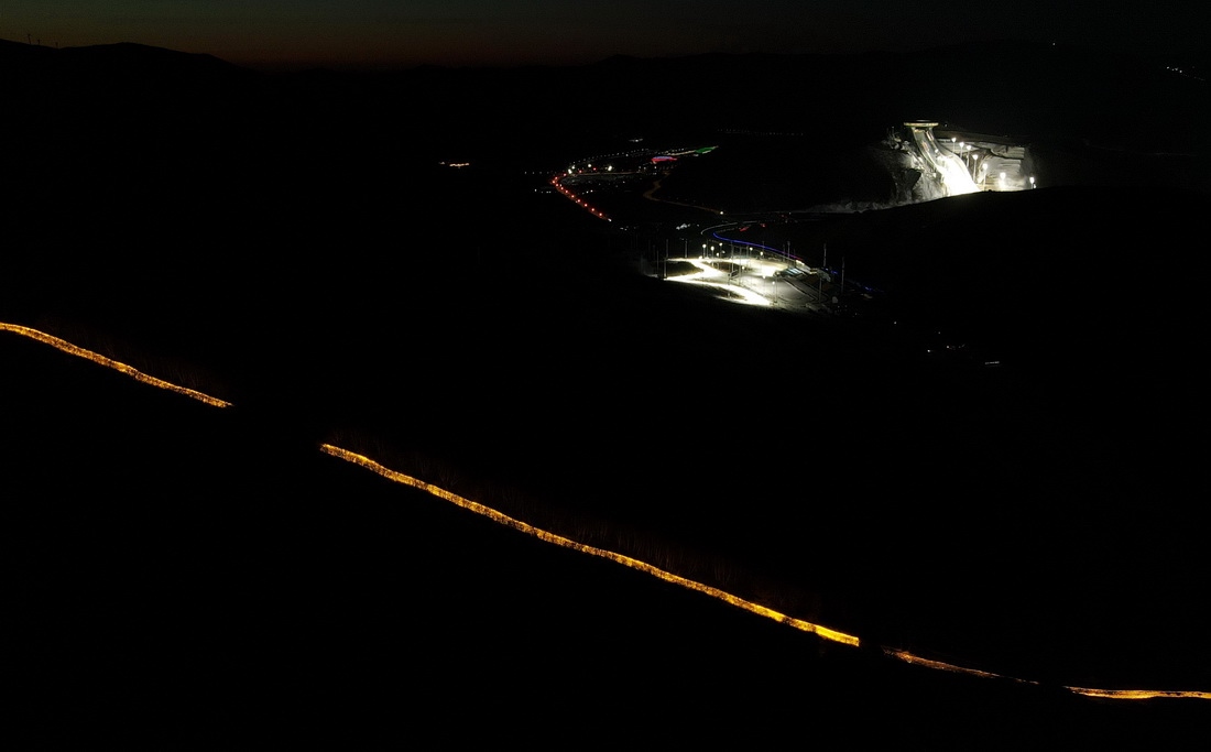 這是12月30日拍攝的崇禮長城景觀展示亮化工程現(xiàn)場,遠(yuǎn)處為國家越野滑雪中心和國家跳臺(tái)滑雪中心(無人機(jī)照片)。新華社記者 牟宇 攝