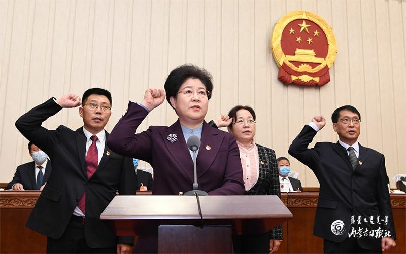 1月20日上午,自治區(qū)十三屆人大常委會第二十四次會議舉行了憲法宣誓儀式。自治區(qū)黨委書記、人大常委會主任石泰峰主持并監(jiān)誓。圖為新任職人員在依法進(jìn)行憲法宣誓。內(nèi)蒙古日報(bào)記者 袁永紅 攝
