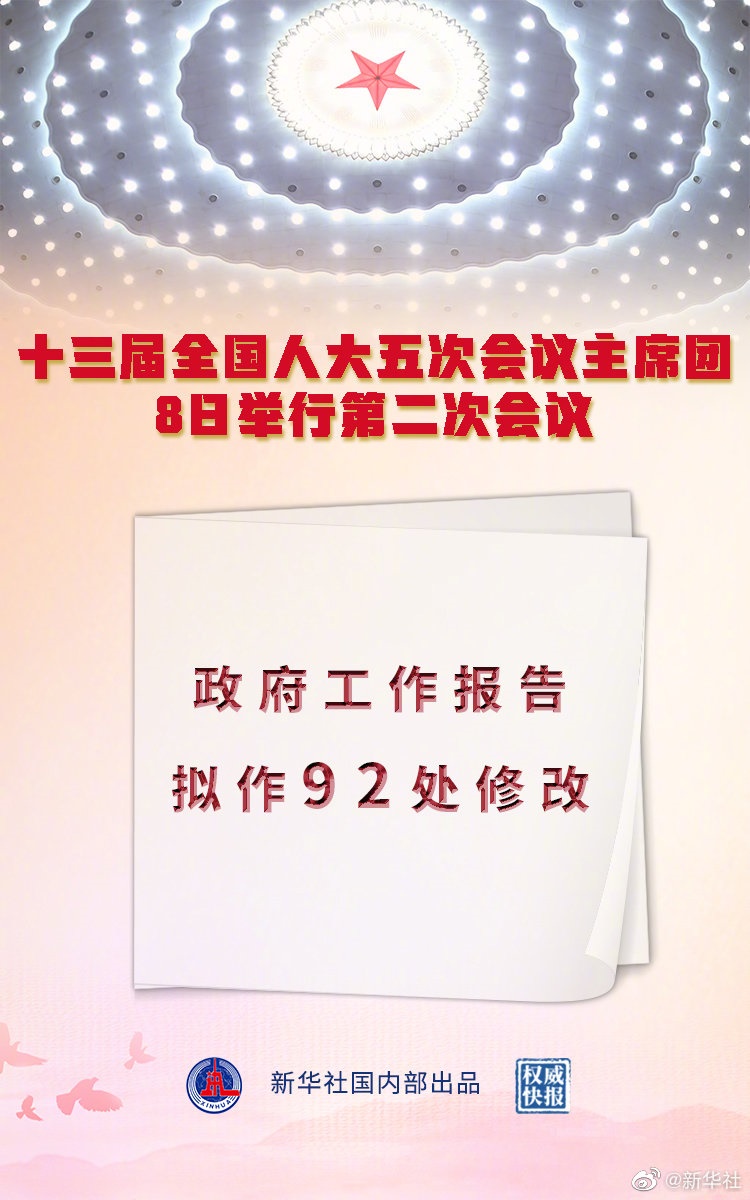 記者8日從十三屆全國(guó)人大五次會(huì)議主席團(tuán)第二次會(huì)議上獲悉,政府工作報(bào)告擬作92處修改?! ?br/>