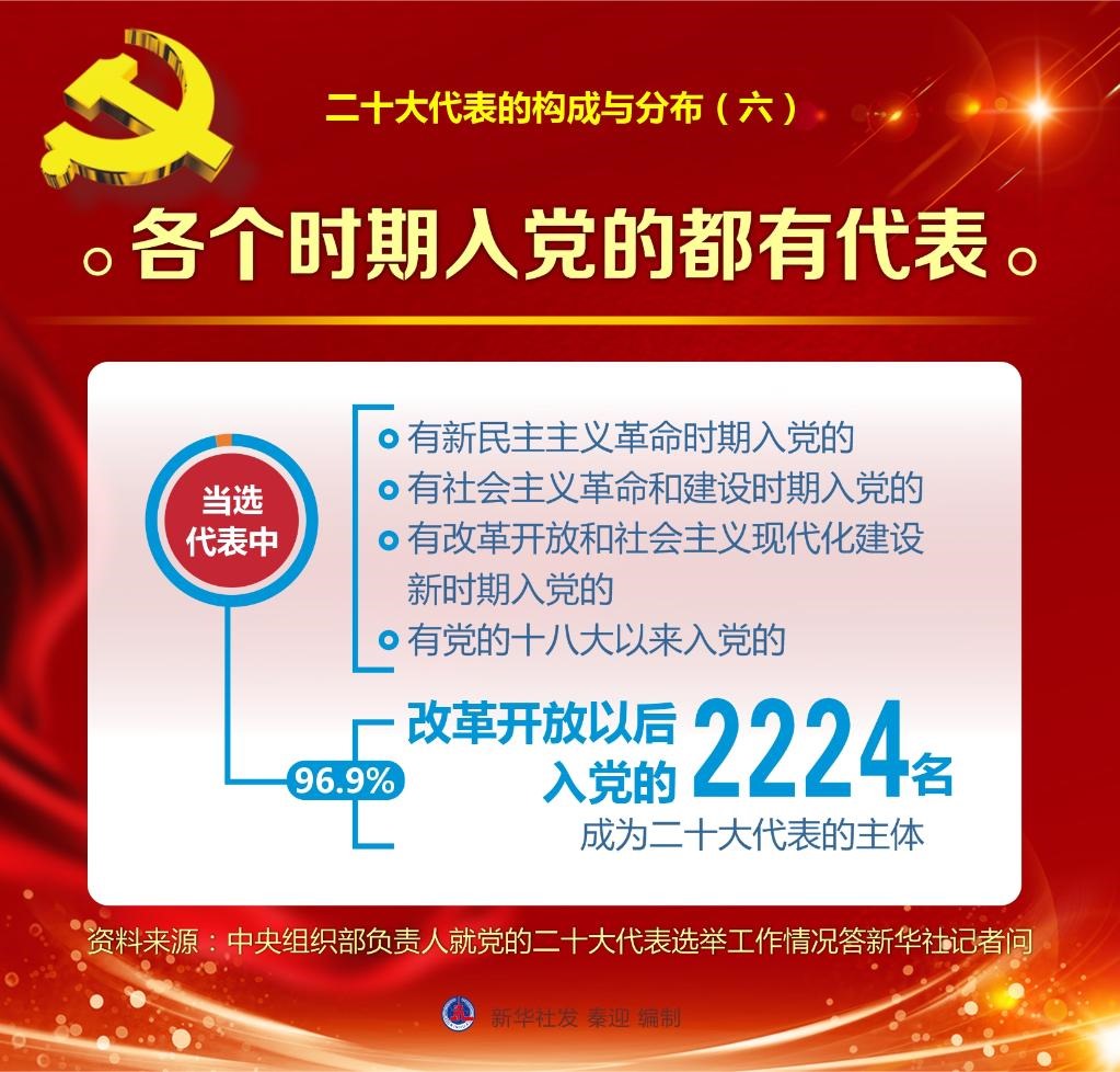 六是各個(gè)時(shí)期入黨的都有代表。當(dāng)選代表中,有新民主主義革命時(shí)期入黨的,有社會(huì)主義革命和建設(shè)時(shí)期入黨的,有改革開(kāi)放和社會(huì)主義現(xiàn)代化建設(shè)新時(shí)期入黨的,有黨的十八大以來(lái)入黨的。其中,改革開(kāi)放以后入黨的2224名,占96.9%,成為二十大代表的主體。