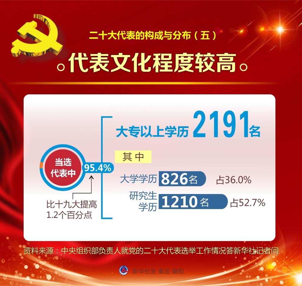 五是代表文化程度較高。當(dāng)選代表中,大專(zhuān)以上學(xué)歷的2191名,占95.4%,比十九大提高1.2個(gè)百分點(diǎn)。其中,大學(xué)學(xué)歷的826名,占36.0%;研究生學(xué)歷的1210名,占52.7%。