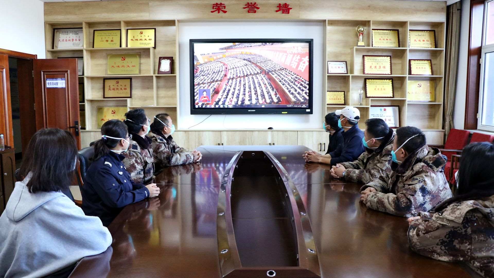 二連出入境邊防檢查站民警收看黨的二十大開幕會。郭鵬杰攝