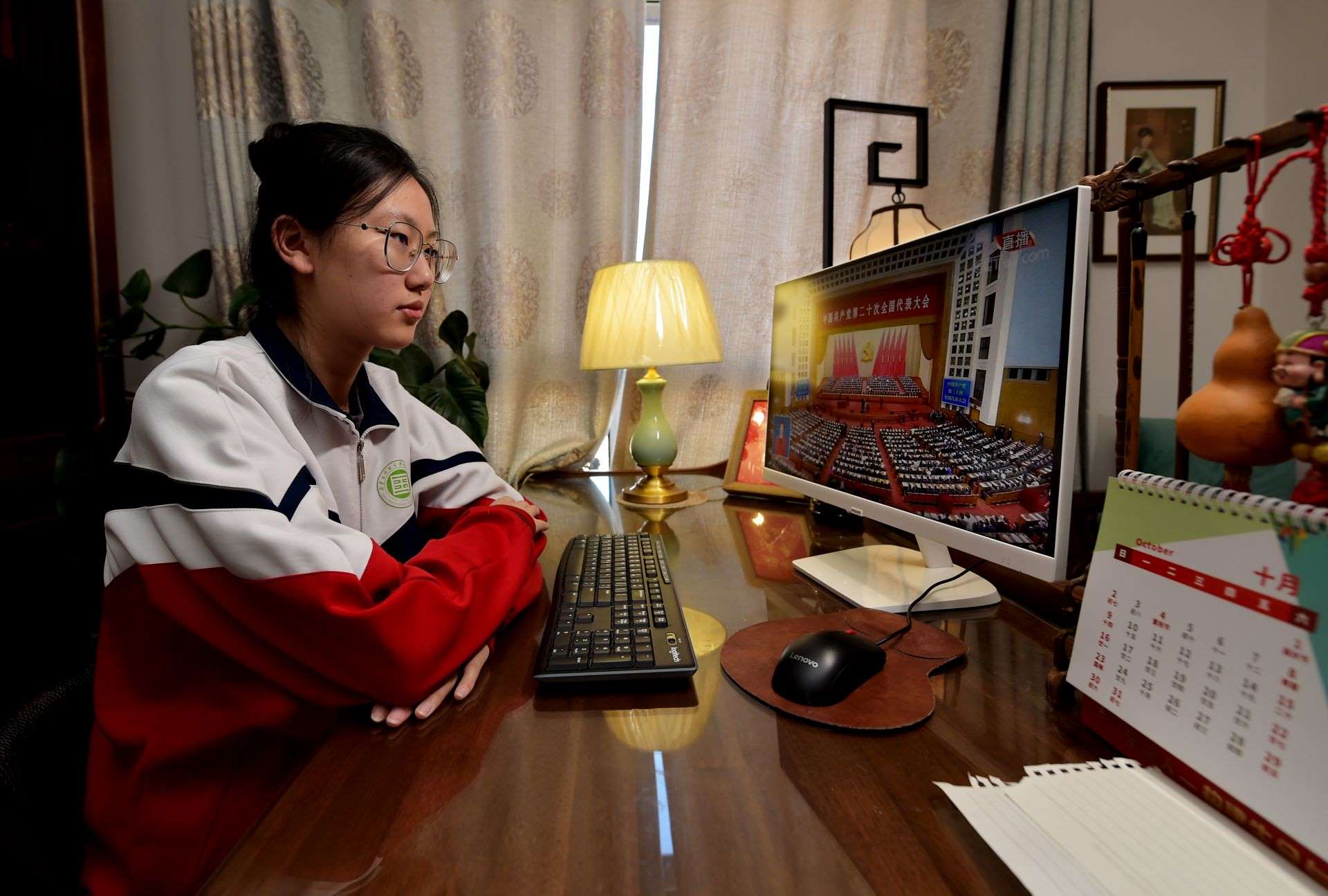 內(nèi)蒙古師范大學(xué)附屬第二中學(xué)的學(xué)生蒙納收看黨的二十大開幕會。本報記者馬建荃攝