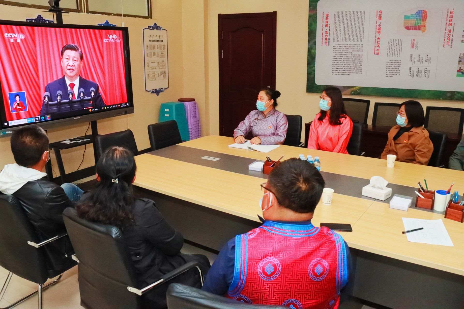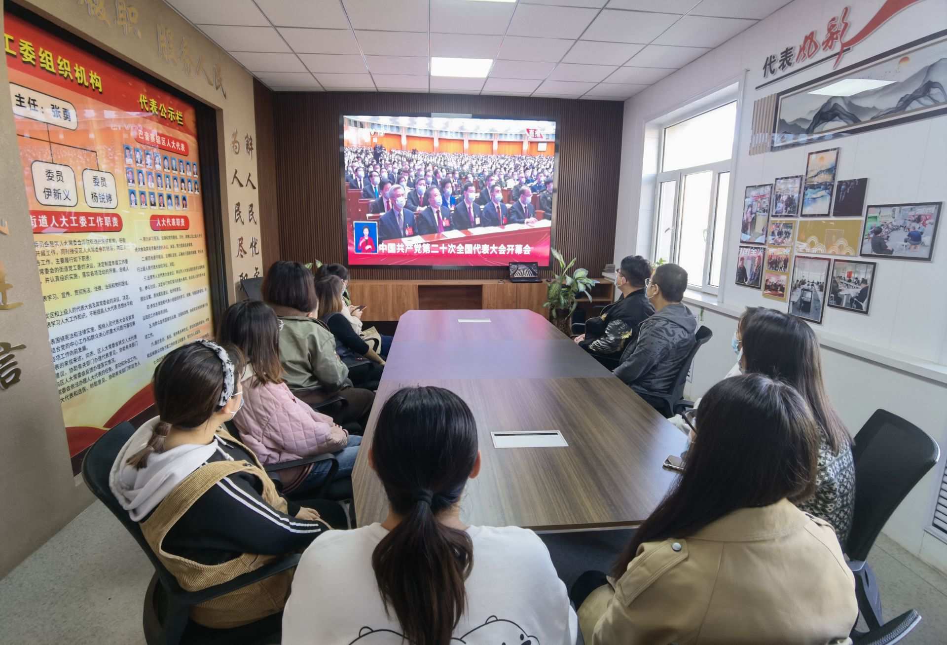 呼和浩特市大學(xué)東路街道工作人員線上收看黨的二十大開幕會。黃麗杰攝