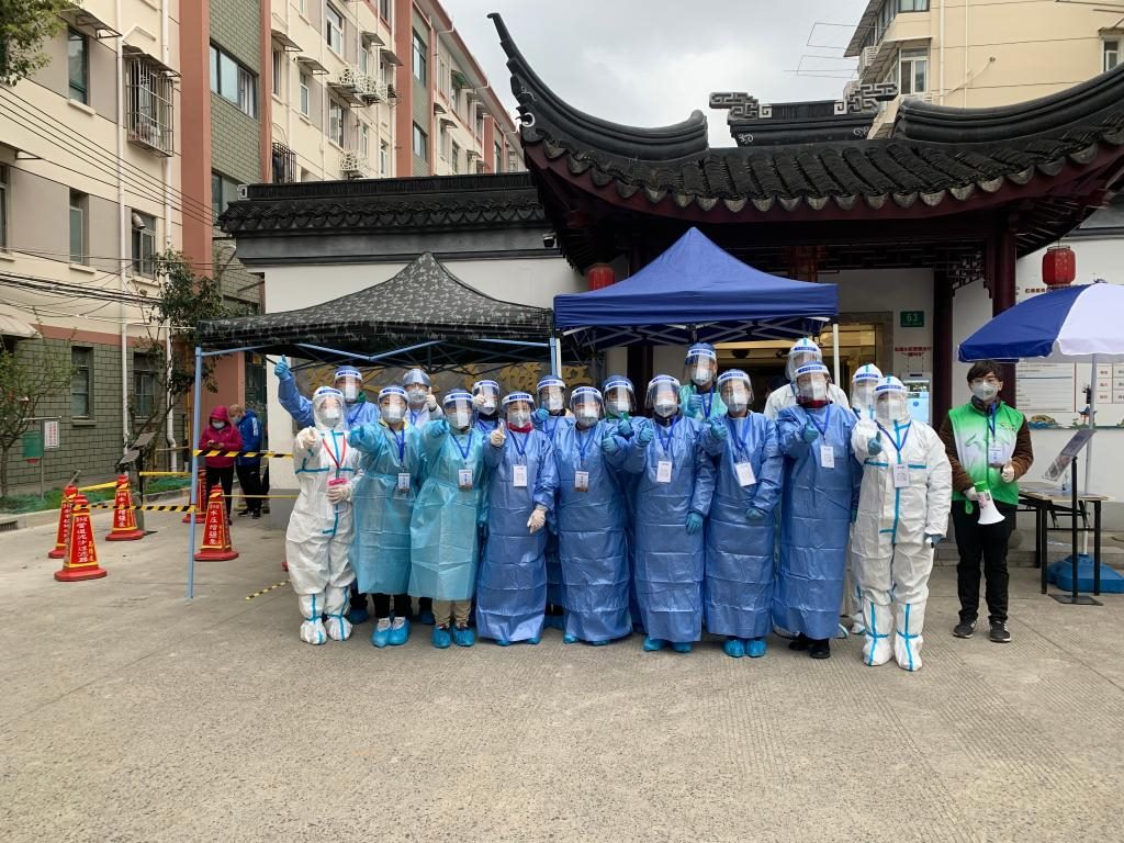虹儲(chǔ)居民區(qū)核酸檢測(cè)采樣點(diǎn),黨員干部、醫(yī)務(wù)工作者以及來自各行各業(yè)的志愿者共同抗疫。受訪單位供圖