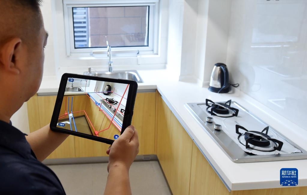 在中新天津生態(tài)城一小區(qū),小區(qū)業(yè)主通過AR房屋使用說明書查看廚房管道線路(2020年8月13日攝)。新華社記者 趙子碩 攝