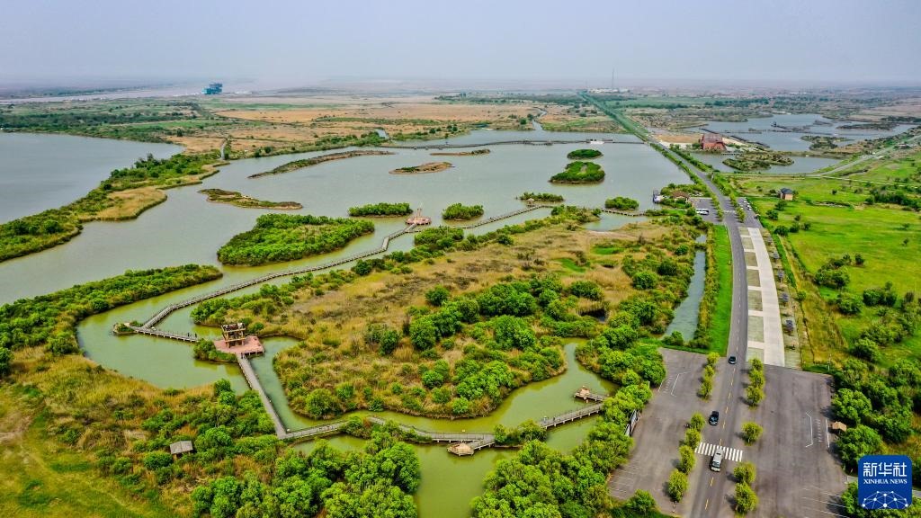 夏日的東營市黃河入??跐竦?,綠草連天、百鳥翔集?! ?/p>