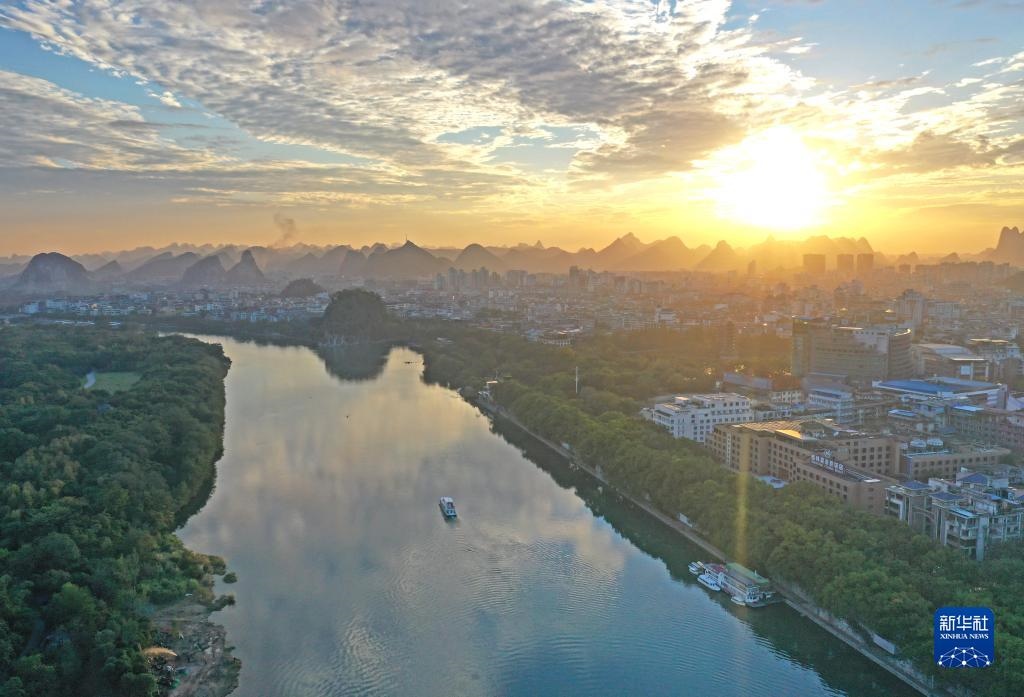 廣西桂林市城區(qū)漓江沿岸風(fēng)光(2021年11月24日攝,無人機(jī)照片)。新華社記者 周華 攝
