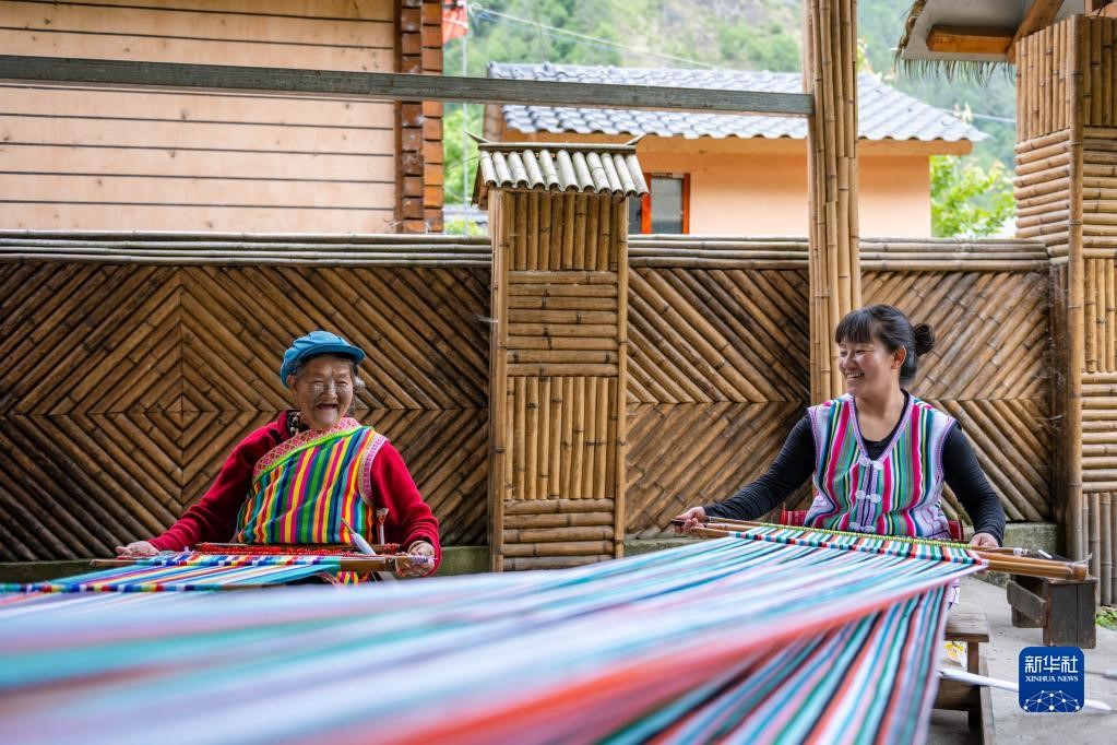 在云南省貢山獨龍族怒族自治縣獨龍江鄉(xiāng)迪政當村,獨龍族老人李文仕(左)和女兒在編織獨龍?zhí)?5月10日攝)。新華社記者 曹夢瑤 攝