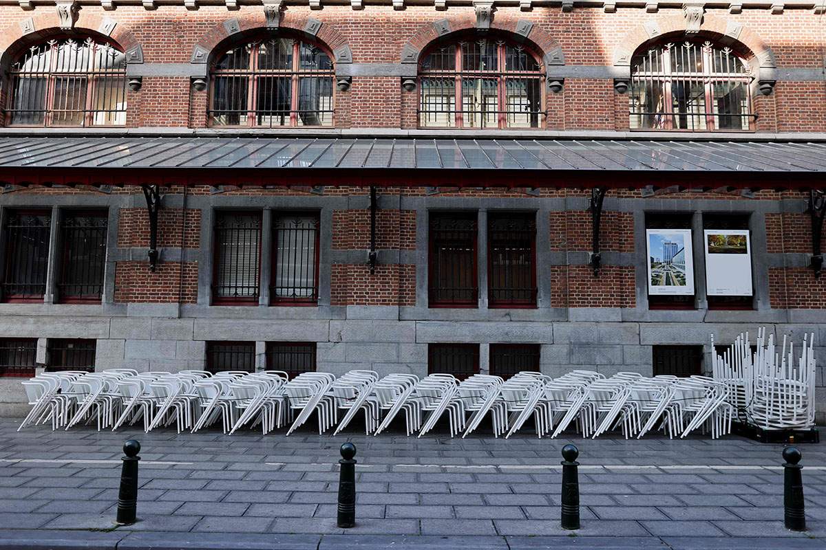 當?shù)貢r間2020年10月19日,比利時布魯塞爾,一家關閉的餐館外的排椅。 -